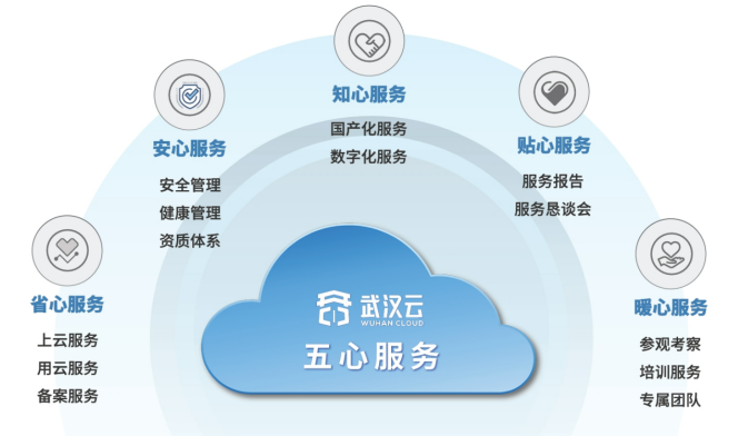 “五心服务”包括省心、安心、知心、贴心和暖心,这五个方面贯穿于武汉云服务城市数字化转型的始终,为城市政务、医保、交通等多场景应用持续优化和创新提供了强大的支撑,也为政务云服务城市数字化转型立下了高标准、严要求。