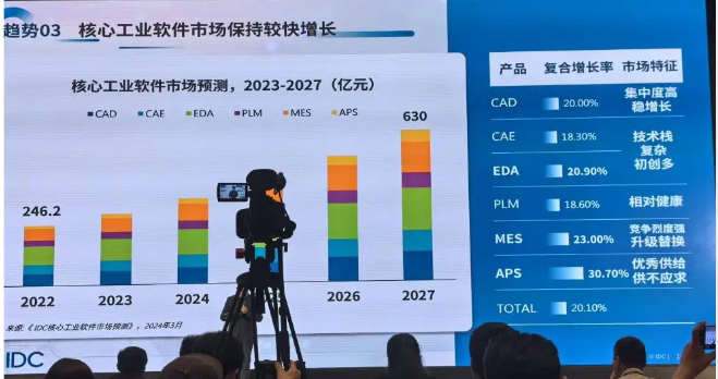 IDC预测,中国核心工业软件(包含CAD、CAE、EDA、PLM、MES软件,不含咨询和实施服务)市场规模将从2023年的273.6亿元人民币增长到2027年的579.6亿元人民币,年复合增长率达到20%。