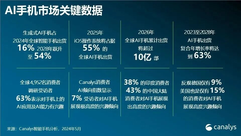 Canalys今日发布了一份关于《AI手机的现在和未来》的深度报告。报告指出,2024年全球16%的智能手机出货为AI手机,到2028年,这一比例将激增至54%。