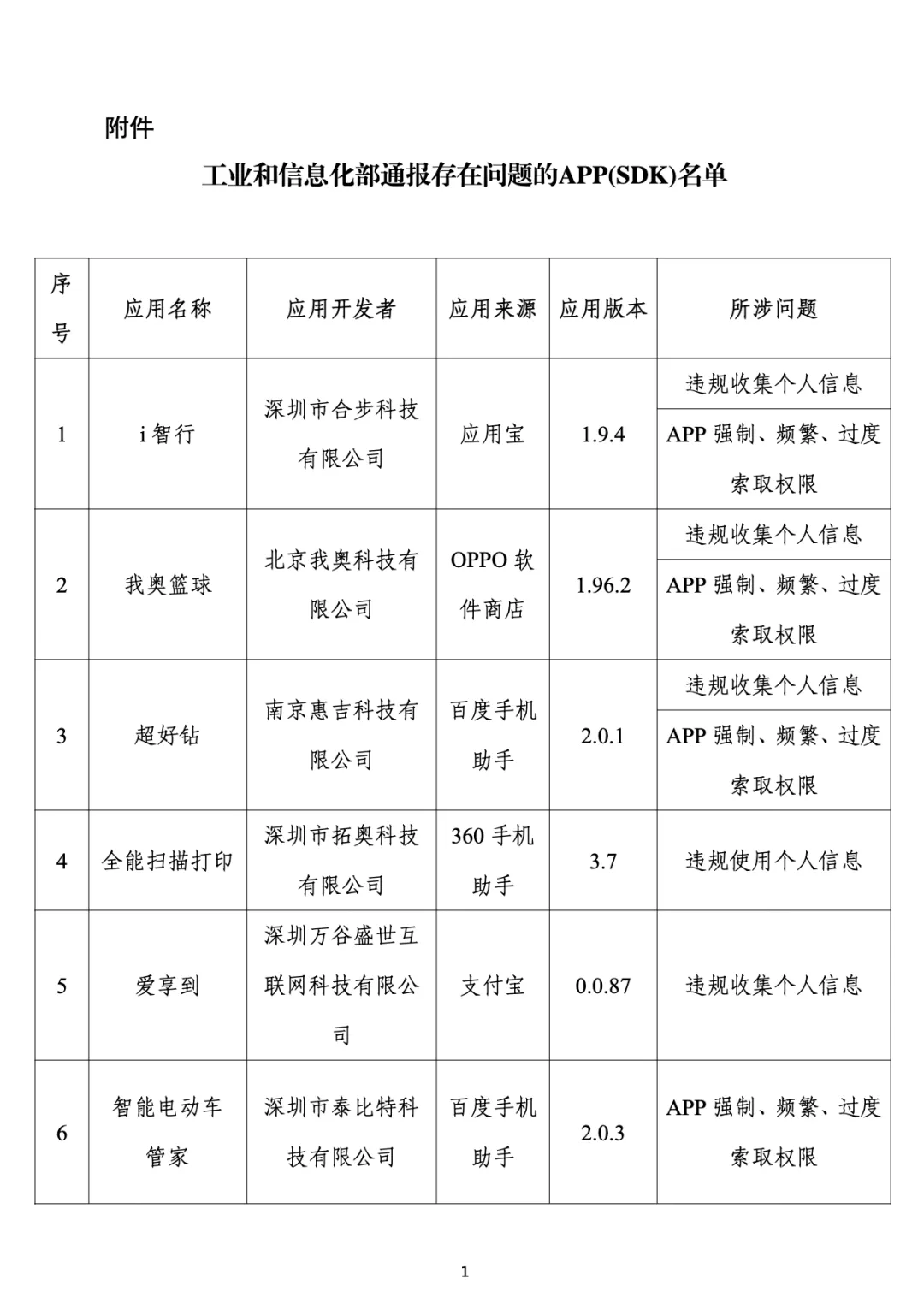 附件:工业和信息化部通报存在问题的APP(SDK)名单