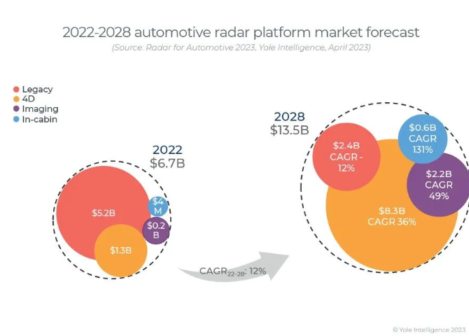 虽然围绕着这个技术的争论不断,但各大主机厂、Tier 1和芯片公司却毫不掩饰地围绕着4D成像雷达推陈出新。据Yole统计显示,2022年,4D成像雷达的市场规模仅为2亿美元。到2028年,这个数字将提高到22亿美元,期间的年复合增长率高达49%。