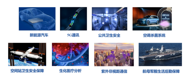 半导体紫外LED光源是国家重大战略需求,优炜芯紫外LED核心技术可应用于新能源汽车、5G通讯、公共卫生安全以及国防科工等领域,具有十分重要的地位与不可替代的作用。