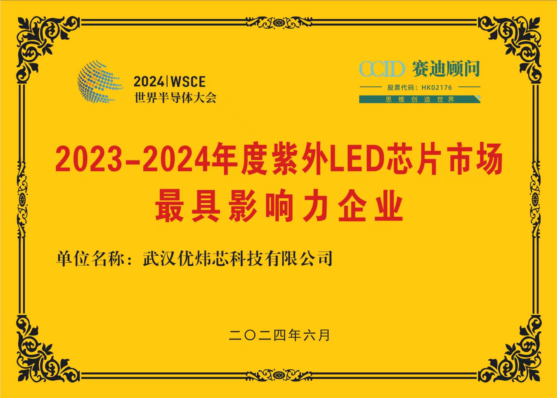 优炜芯荣获“2023-2024中国紫外LED芯片市场最具影响力企业奖”。