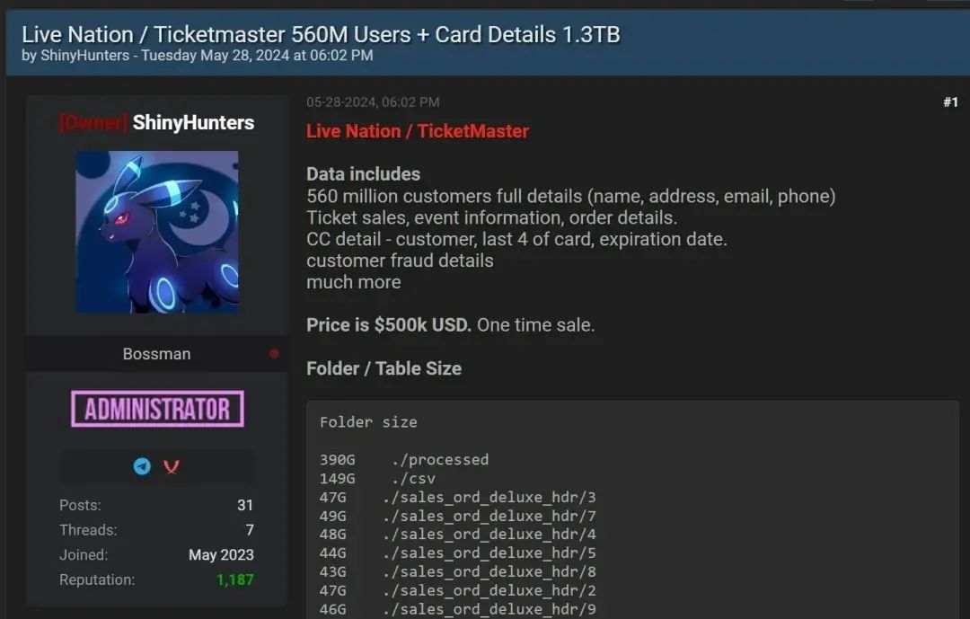 此前,一个名为Shiny Hunters的威胁分子曾试图在黑客论坛上以50万美元的价格出售Ticketmaster数据。