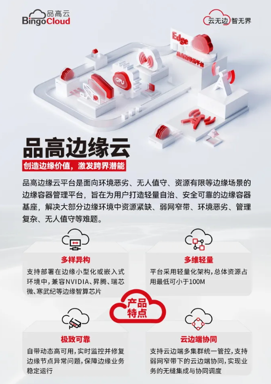 品高边缘云平台可在嵌入式板卡、服务器、智能终端设备等边缘小型化或嵌入式环境中完整交付计算、网络、存储、仓库以及可观测性等组件,构建功能齐全的K8s集群,含操作系统在内,整个平台最小开销小于100MB;