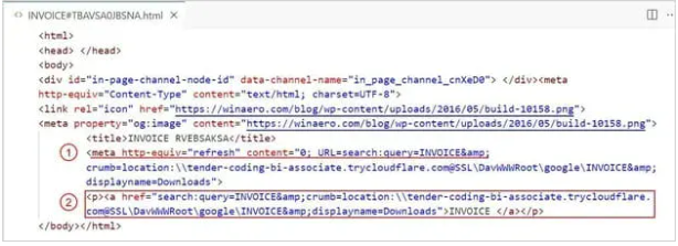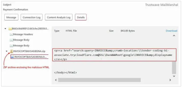 Trustwave报告中描述的近期攻击始于一封恶意电子邮件,该邮件带有一个伪装成发票文档的HTML附件,该附件位于一个小型ZIP存档中。ZIP有助于逃避可能无法解析存档中的恶意内容的安全/AV扫描程序。