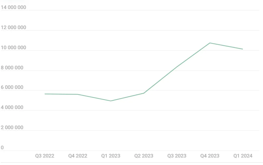 2023年第一季度至2024年第一季度,卡巴斯基检测到的手机银行木马安装包数量