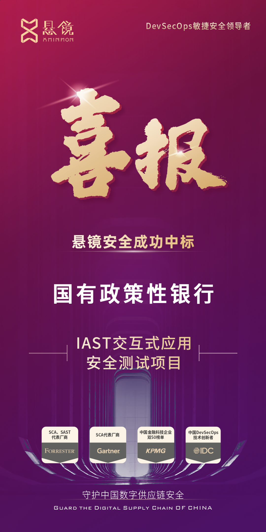 近日,悬镜安全成功中标国有政策性银行“IAST交互式应用安全测试”项目,中标产品为灵脉IAST灰盒安全测试平台。