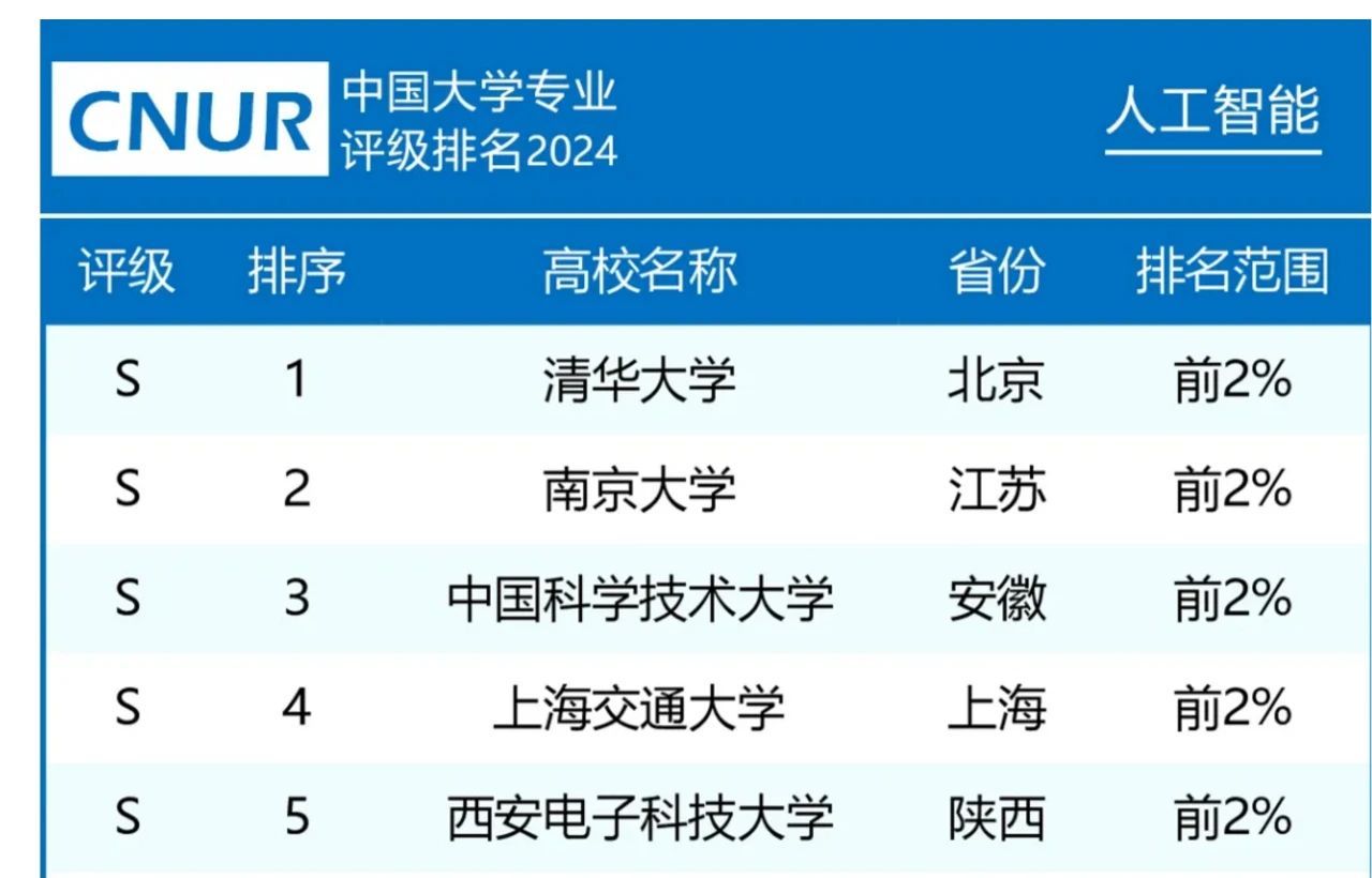 据悉,在已经开设人工智能专业的高校中,以山东、江苏、河南、湖北、北京等地的数量为最多。2024年3月6日,中国大学评价领先品牌CNUR正式发布“2024年人工智能专业评级排名”。清华大学、南京大学、中国科学技术大学、上海交通大学、西安电子科技大学这五所大学的评级结果为S,即最高级别。