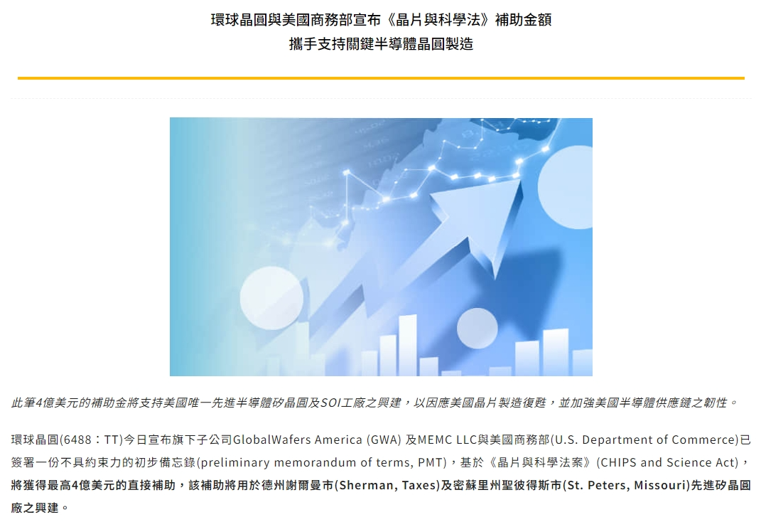 7月17日,环球晶圆宣布,旗下子公司GWA及MEMC LLC将获得美国4亿美元的资金补助。