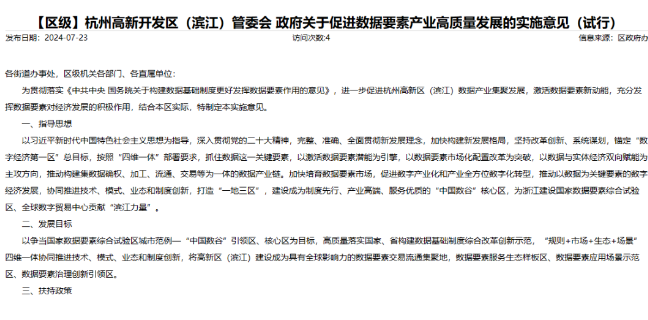 7月23日,杭州高新开发区(滨江)管委会印发《关于促进数据要素产业高质量发展的实施意见(试行)》。