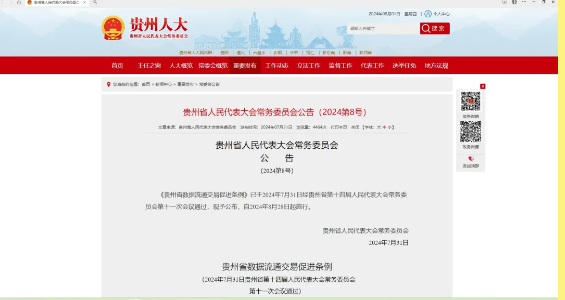 《贵州省数据流通交易促进条例》已于2024年7月31日经贵州省第十四届人民代表大会常务委员会第十一次会议通过,现予公布,自2024年8月28日起施行。