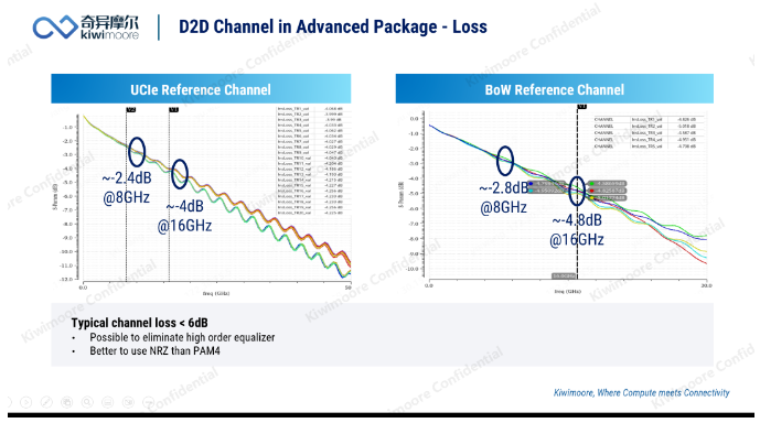 得益于D2D互联间距较短,相比传统的高速互联接口,D2D接口信道的损耗较低。我们考察了多种D2D互联协议的参考信道,在其最高工作频率下的信道损耗均小于-6dB,在实际设计信道的过程中,这一指标通常可以控制得更加优越(-2~-3dB)。较低的信道损耗使得高阶均衡不再是一个必须项,同时,简单的调制方式(如NRZ)就能实现较高数据率的传输,这些特点均为高能效数据传输提供了有利条件。