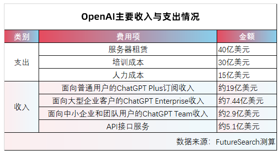 作为崛起速度最快的AI初创企业之一,OpenAI的盈利能力一直是业界关注焦点。知情人士透露的未公开内部财务数据显示,OpenAI今年运营总成本可能将达85亿美元,主要分为推理成本、训练成本和人工成本三大块。其中,推理和训练成本分别高达40亿美元和30亿美元。然而根据此前已公开信息推测,OpenAI全年收入预估在35亿美元至45亿美元之间。也就是说,OpenAI今年或面临高达50亿美元的巨额亏损。