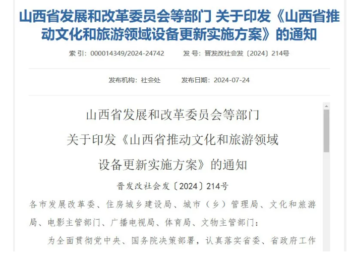 近期,山西省发展和改革委员会等部门印发了《山西省推动文化和旅游领域设备更新实施方案》。