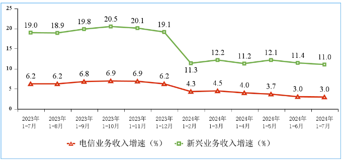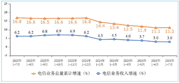 电信业务收入稳步增长,电信业务总量增速小幅回升。1—7月份,电信业务收入累计完成10354亿元,同比增长3%,增速与上半年持平。按照上年不变价计算的电信业务总量同比增长11.2%。