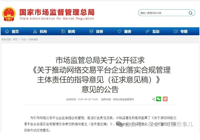 2024年9月9日,国家市场监管总局组织起草了《关于推动网络交易平台企业落实合规管理主体责任的指导意见(征求意见稿)》,现向社会公开征求意见。