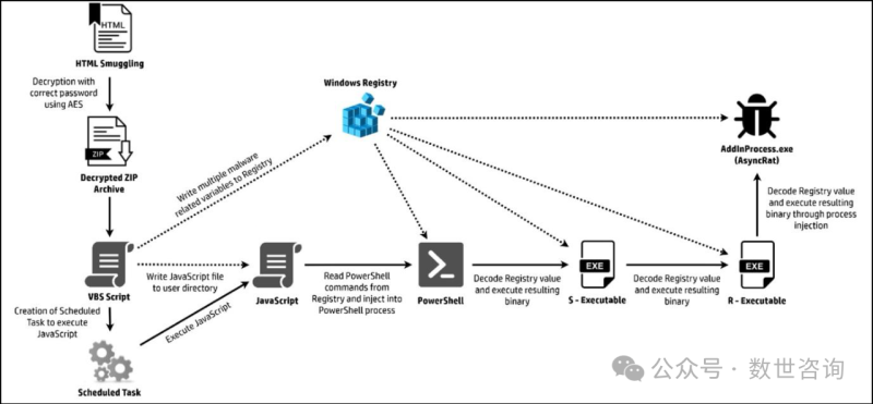 解密后的附件启动后呈现为一个网站界面,但实际上隐藏了VBScript和AsyncRAT信息窃取程序。VBScript是信息窃取程序的加载器,它向Windows注册表写入多个变量,并在用户目录中投放JavaScript文件,该文件随后作为计划任务执行。此外,还会创建一个PowerShell脚本,通过这一系列操作最终触发AsyncRAT恶意软件的运行。
