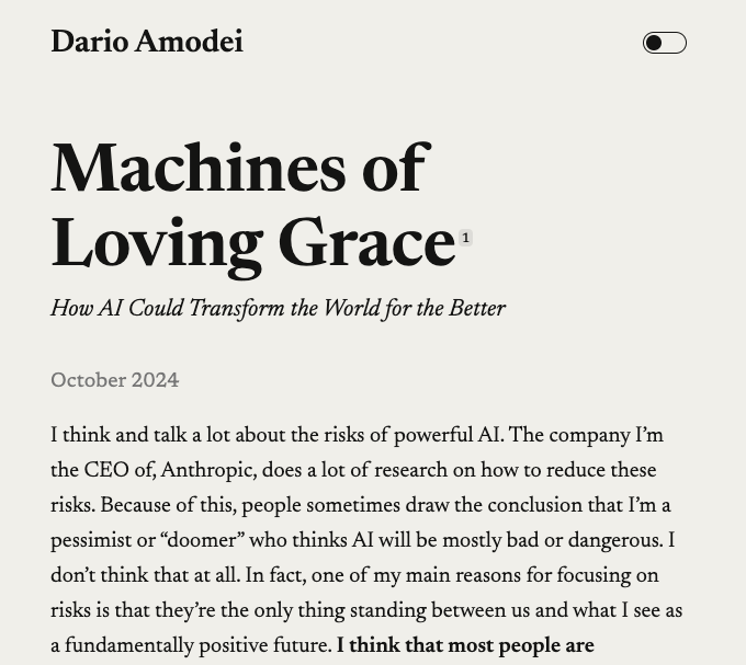 人工智能大模型企业Anthropic的CEO Dario Amodei发表题为《Machines of Loving Grace:How AI Coulf Transform the World for the Better》(AI能如何改变世界,创造更美好的未来)的署名长文。