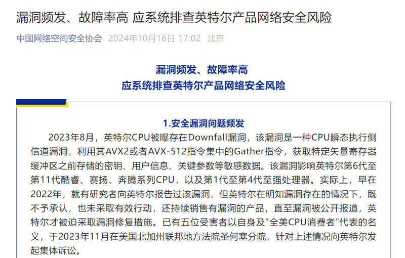10月16日,中国网络空间安全协会发布题为《漏洞频发、故障率高应系统排查英特尔产品网络安全风险》公众号文章,明确指出了英特尔的四项安全问题:一是安全漏洞问题频发;二是可靠性差,漠视用户投诉;三是假借远程管理之名,行监控用户之实;四是暗设后门,危害网络和信息安全。