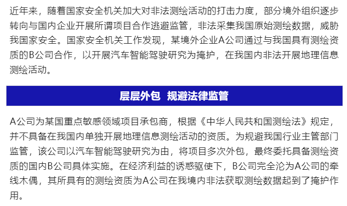 国安部的通报指出,A公司为某国重点敏感领域项目承包商,并不具备在我国内单独开展地理信息测绘活动的资质。为规避我国行业主管部门监管,该公司以汽车智能驾驶研究为由,将项目多次外包,最终委托具备测绘资质的国内B公司具体实施。通过与B公司的合作,A公司在我国境内非法获取测绘数据。