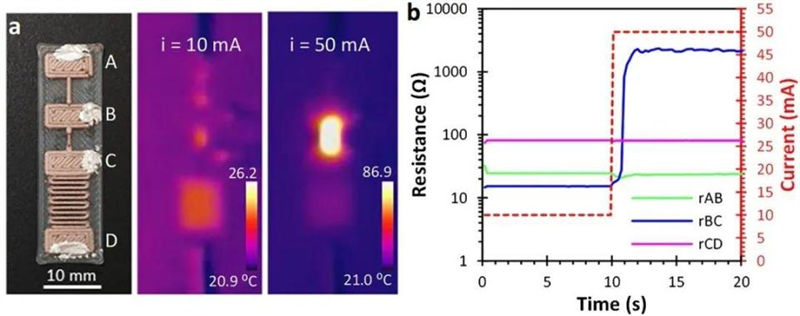 在该项目中,研究人员成功展示了完全3D打印的可复位保险丝,这是有源电子设备中通常需要半导体的关键部件。该研究展示了使用标准3D打印硬件和廉价可生物降解材料制作的无半导体设备,能够执行与传统基于半导体的晶体管相同的开关功能。