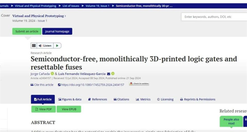 该研究论文已发表在《虚拟和物理原型》期刊上,题目为“无半导体、单片3D打印逻辑门和可复位保险丝”
