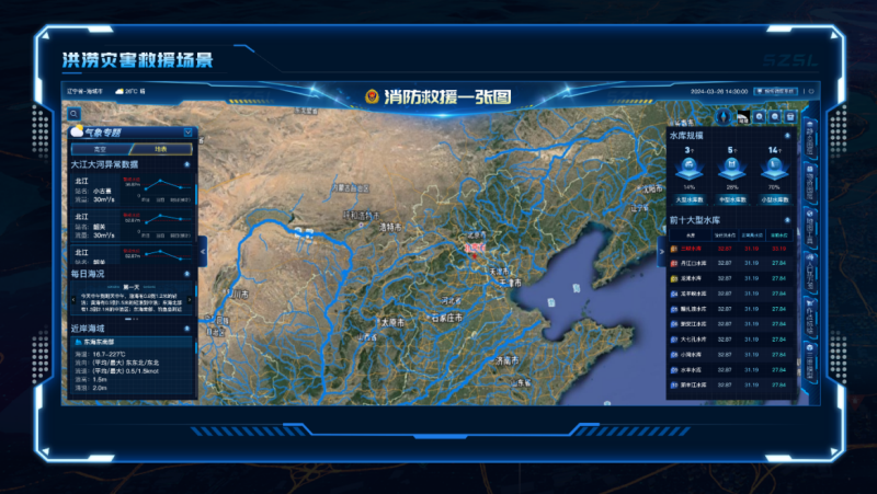 二是场景化应用定制,提升应急响应能力。针对城市大型综合体救援场景,实时调阅警情基本信息、火灾处置要点、周边消防水源、作战安全提示等关键信息要素,终端共享消防智能穿戴设备数据,动态掌握救援人员情况。针对地震灾害救援场景,接入遥感卫星影像、无人机全景测绘等实时资源,利用AI地物识别等手段生成灾前灾后对比图,直观了解灾区情况,实时智能统计重点区域的人口数量并汇聚显示人口热力图,监控人口分布,为指挥员科学调度力量精准指挥提供支撑。针对洪涝灾害救援场景,实时接入气象、风象、水情、风力等关键预报数据,提供洪涝灾害突发事件预警信息,实时呈现全国24小时内的气象预警和天气预报情况,精准追踪各省份的突发事件,实时监控水库区、河流区等重点防治区域,准确展示异常水域具体位置。