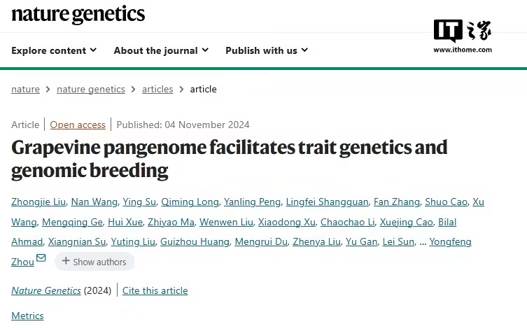 IT之家11月4日消息,IT之家从中国农科院基因组所官方微信公众号获悉,今日《自然・遗传学(Nature Genetics)》在线发表了中国农业科学院深圳农业基因组研究所(岭南现代农业科学与技术广东省实验室深圳分中心)周永锋团队利用人工智能进行葡萄育种的最新研究成果。该研究将大幅缩短葡萄育种周期,且对葡萄农艺性状的预测准确度高达85%。相比传统方法,育种效率可提高400%。该研究有望实现葡萄的精准设计育种,加速葡萄品种创新,并为其他多年生作物育种提供方法参考。