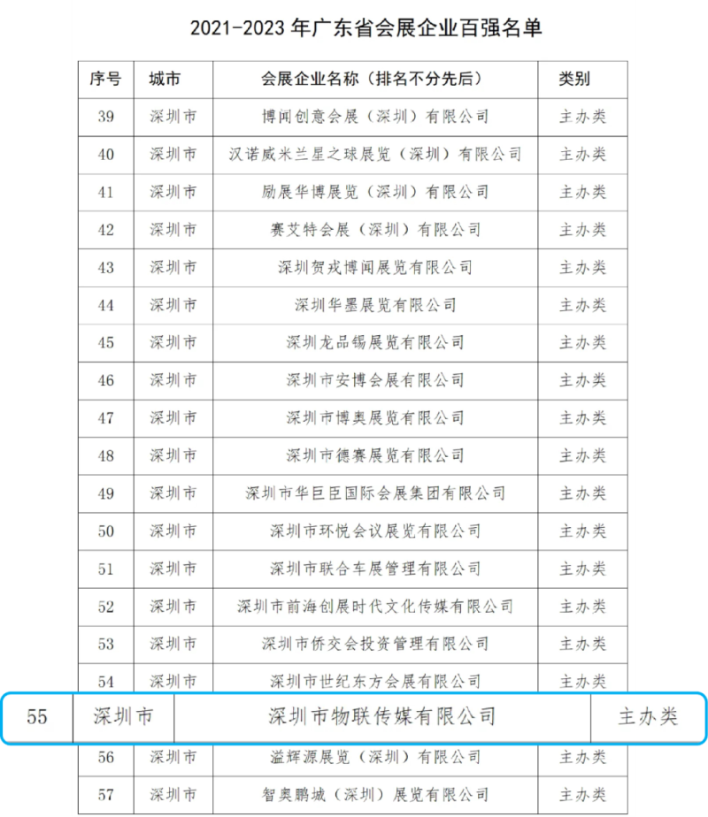 在广东省商务厅公布的2021-2023年广东省会展企业百强和会展项目百强认定名单中,深圳市物联传媒有限公司以其卓越的会展组织能力和创新的展会理念,荣获会展企业百强称号。同时,公司旗下标志性展会——IOTE国际物联网展,以其在物联网领域的深远影响力和专业水准,再次入选会展项目百强名单。
