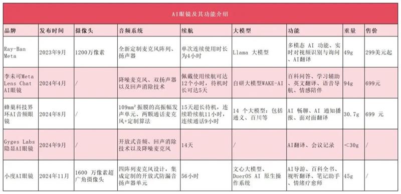 不同于AR智能眼镜,AI眼镜不具备虚拟显示的功能,更强调AI交互功能。从上述产品中也可以看到,几乎大多数品牌都在AI眼镜中集成了AI大模型。