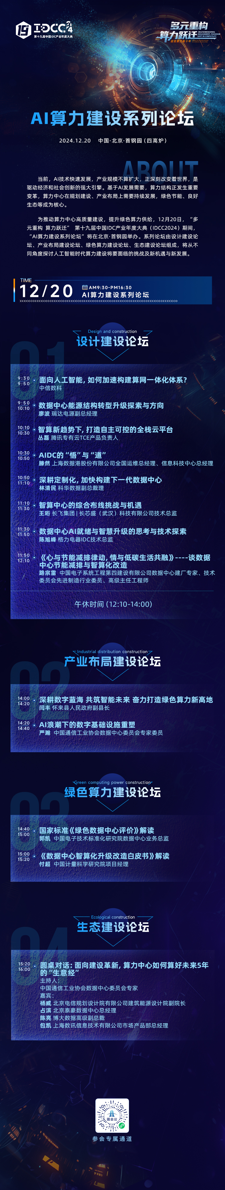 为推动算力中心高质量建设,提升绿色算力供给,12月20日,“多元重构算力跃迁”第十九届中国IDC产业年度大典(IDCC2024)期间,“AI算力建设系列论坛”将在北京·首钢园举办。