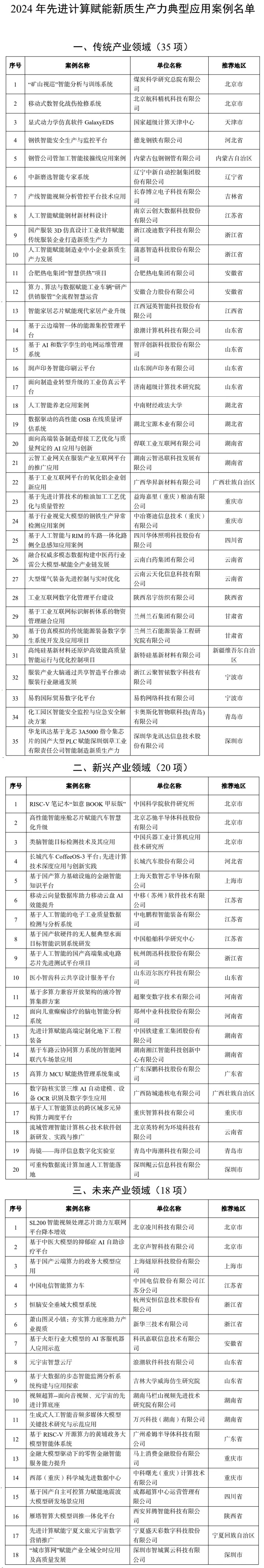 根据《工业和信息化部办公厅关于征集先进计算赋能新质生产力典型应用案例的通知》(工信厅电子函〔2024〕368号),经各地工业和信息化主管部门推荐、专家评审和网上公示,确定了73项先进计算赋能新质生产力典型应用案例(名单见附件),现予以公布。