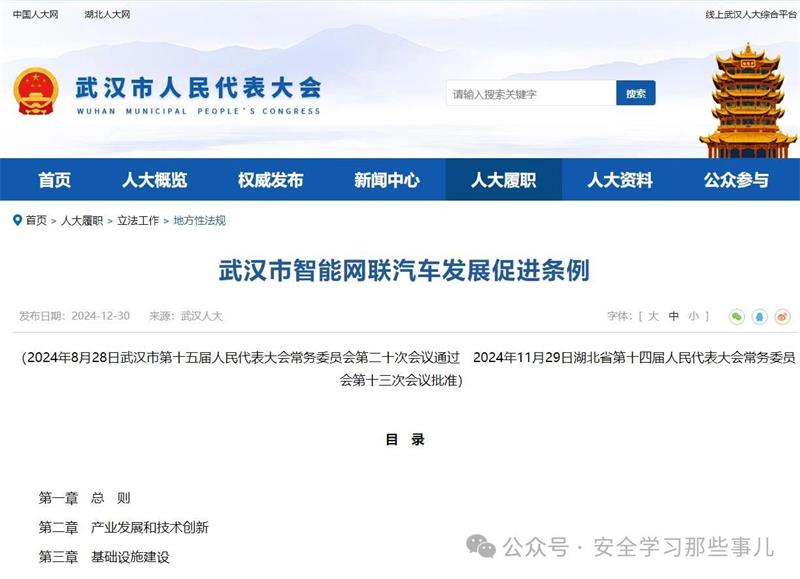 2024年12月30日,武汉市人大常委会公布《武汉市智能网联汽车发展促进条例》,条例自2025年3月1日起施行。