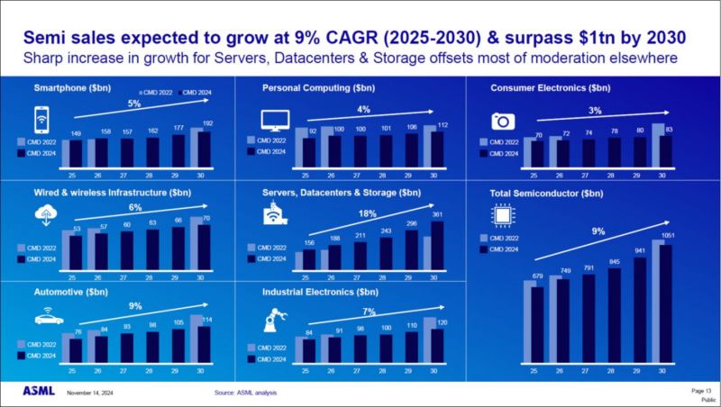 上图是2024年在ASML投资者日是展示的PPT,主题是“终端市场、晶圆需求和光刻支出”。这张图展示了从2025年到2030年中,各种电子设备(例如智能手机、个人电脑、消费者、有线和无线基础设施、服务器、数据中心和存储、汽车和工业设备)的增长量,同时还有全球半导体行业的增长情况。从图中可以看出,半导体市场能够增长多少。