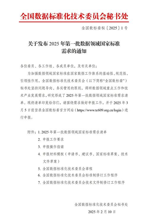 为加强数据领域国家标准在国家数据工作体系的基础性、规范性、引领性作用,全国数据标准化技术委员会(以下简称“全国数标委”)秘书处坚持问题导向、务实管用的原则,调研数据领域重点工作和技术产业发展需求,研究形成了2025年第一批数据领域国家标准需求清单。现将清单印发给你们,请围绕需求做好申报工作,并于2025年3月5日前登录全国数标委官方网站(https://www.tc609.org.cn/login)进行申报。