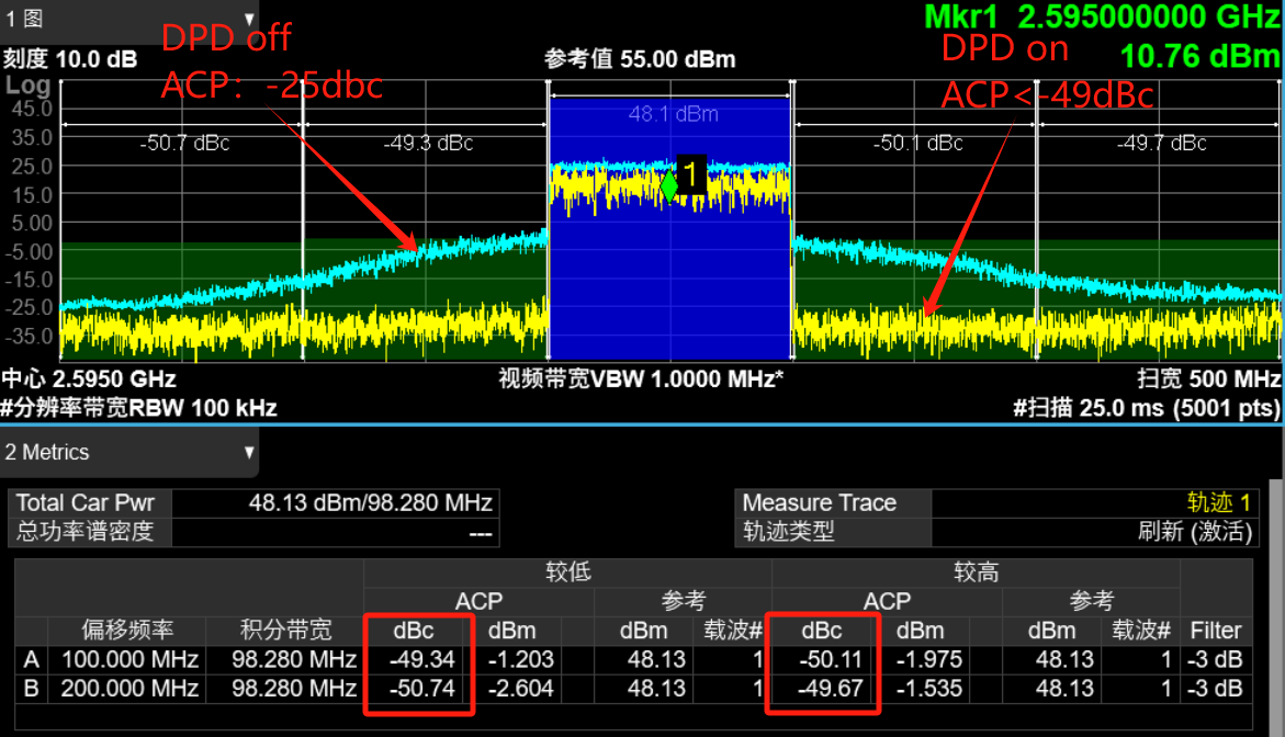 同样情况下,使用top厂家的DPD进行性能测试,测试信号带宽100MHz,DPD校正开启后ACLR优于-45dBC,测试结果如下: