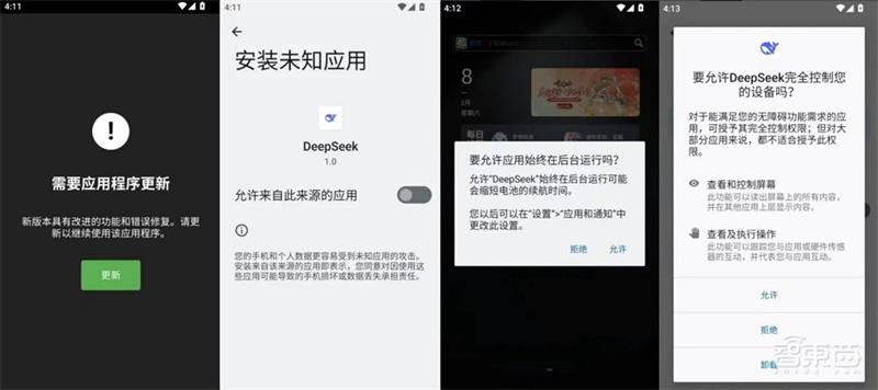 用户点击后,会提示安装所谓的“新版”DeepSeek应用程序。这实际上是包含恶意代码的子安装包,并会诱导用户授予其后台运行和使用无障碍服务的权限。交出这些权限,就基本相当于将手机的控制权交给了这款恶意App。