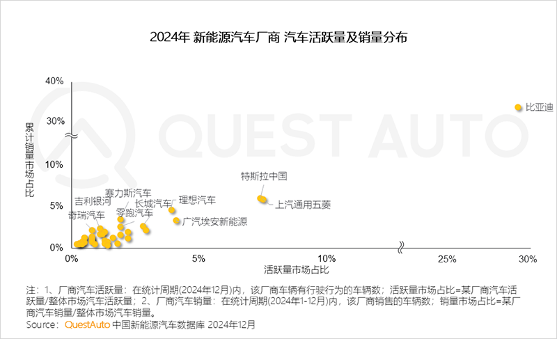 3、汽车厂商活跃量方面,截止2024年底,比亚迪汽车活跃量已超800万辆,上汽通用五菱、特斯拉中国活跃量均超两百万辆,“百万辆俱乐部”新入广汽埃安新能源和理想汽车,赛力斯汽车凭借223.9%的同比增速跻身TOP10
