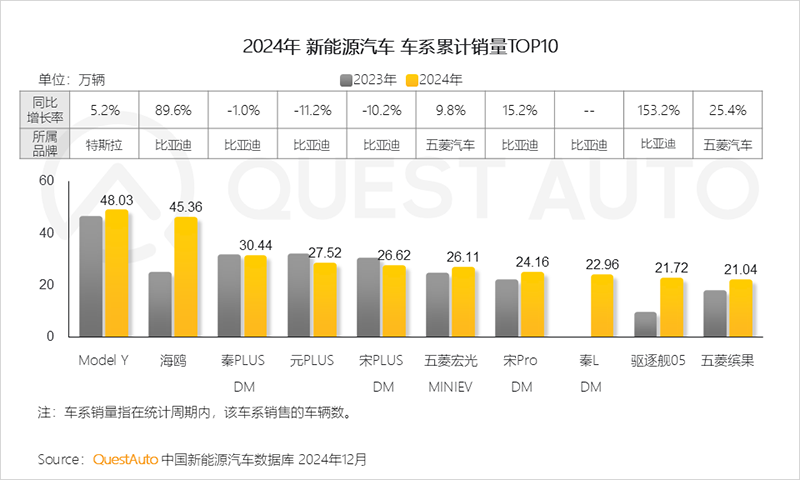 4、具体车系方面,特斯拉旗下Model Y累计销量48万辆位居首位,全年销量TOP10车系中比亚迪占据七席,五菱汽车旗下五菱宏光MINIEV、五菱缤果分别凭借26万辆、21万辆跻身TOP10
