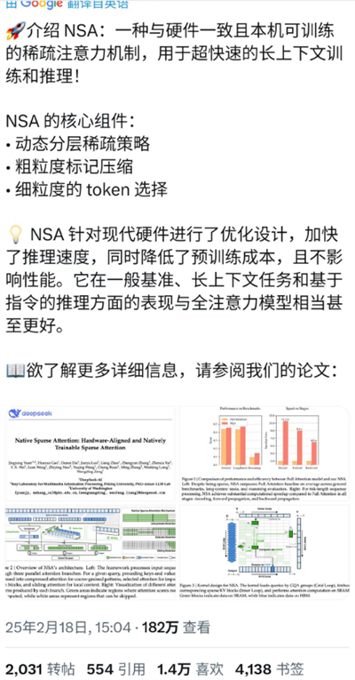 所以总结下来,NSA的出现解决了稀疏注意力机制在实际应用中的两大难题。在推理效率上,NSA显著加快长文本处理速度,令大模型能够处理更多超长文本任务;在训练上,NSA相比传统的稀疏注意力机制,可以更好地支持模型训练。