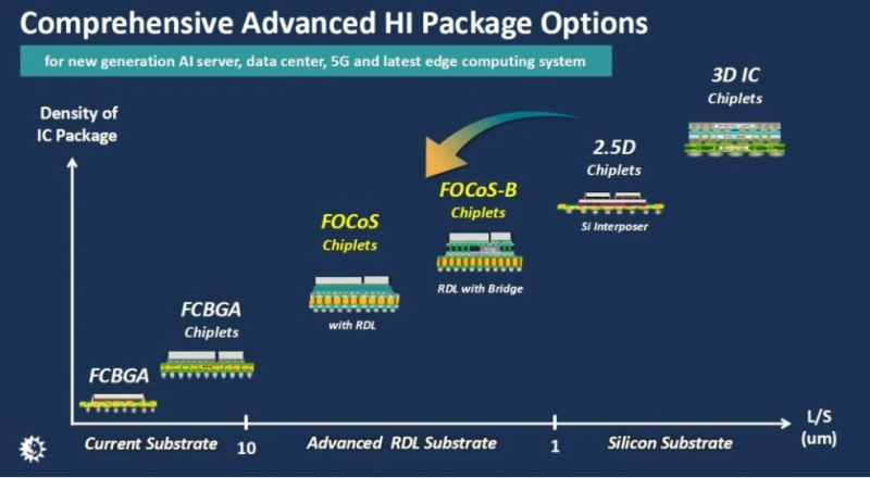 AI硬件的首次演进侧重于使用先进的HI封装来集成来自不同晶圆节点的芯片,尤其是用于集成逻辑和内存。ASE提供高密度封装解决方案,旨在满足AI和HPC应用对更高带宽和更快数据传输速率日益增长的需求。我们的产品包括2.5D和3D IC、扇出型基板芯片(FOCoS)和FOCoS-Bridge。