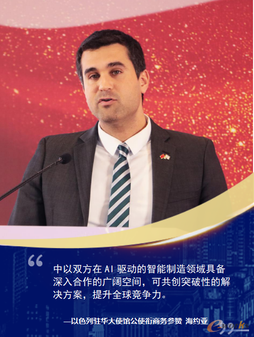 以色列驻华大使馆公使衔商务参赞海约亚(Yoav Haimi)先生发表致辞。他对以色列在人工智能、智能制造和工业软件等领域的创新成果进行了总结,并列举了诸多以色列企业在相关领域的创新技术及应用实践。他对中以两国在智能制造领域的合作前景进行了展望,强调双方在人工智能驱动的自动化、工业网络安全和智能工厂等领域,具备深入合作的广阔空间,希望双方携手共创突破性的解决方案,共创智能制造的崭新时代。