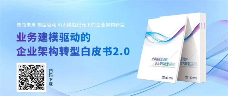 在此背景下,中电金信发布了《业务建模驱动的企业架构转型白皮书2.0——智领未来,模型驱动,AI大模型纪元下的企业架构转型》(以下简称“企架白皮书2.0”)。企架白皮书2.0确立了“企业级、敏捷化、精益化、智能化四位一体”的新企架-NEA行动纲领,论述了业务建模驱动的企业架构转型应用场景和价值,前瞻性地提出了智能化业务建模体系,基于先进的业务建模思想和工艺方法论构建Hyper-Agent业务建模智能体,指引企业数字化转型新路径。