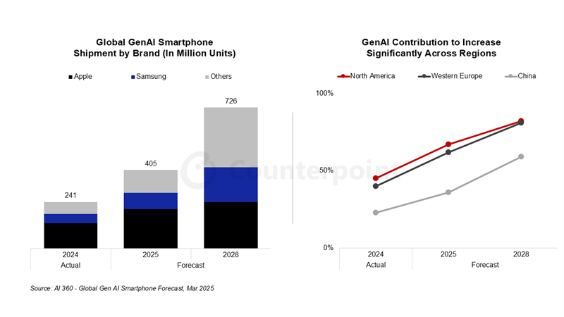 根据Counterpoint的最新预测,2025年全球智能手机市场将迎来一个重要的里程碑:三分之一的智能手机出货量将支持生成式人工智能(GenAI),预计全年出货量将超过4亿部。这一趋势标志着智能手机行业在人工智能技术集成方面的快速进步,也预示着GenAI将成为未来智能手机的核心功能之一。