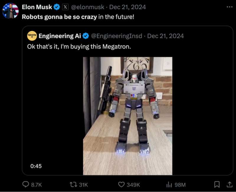 这让很多人看到了AI玩具的吸引力。之后,马斯克在社交媒体上点赞了一款中国的AI玩具,能够随着主人的“变身”辗转腾挪,最终变身成威震天。