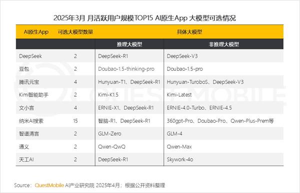 受DeepSeek影响,各家纷纷引入自研推理模型,或者上马开源的R1模型,短时间内,“双模型”“多模型”成了新老玩家的标配,例如纳米AI搜索号称可以使用15个大模型。在各家“多模型+无限算力”的“内卷”之下,去年以来持续困扰行业内的“用户高流失率难题”被快速破解。