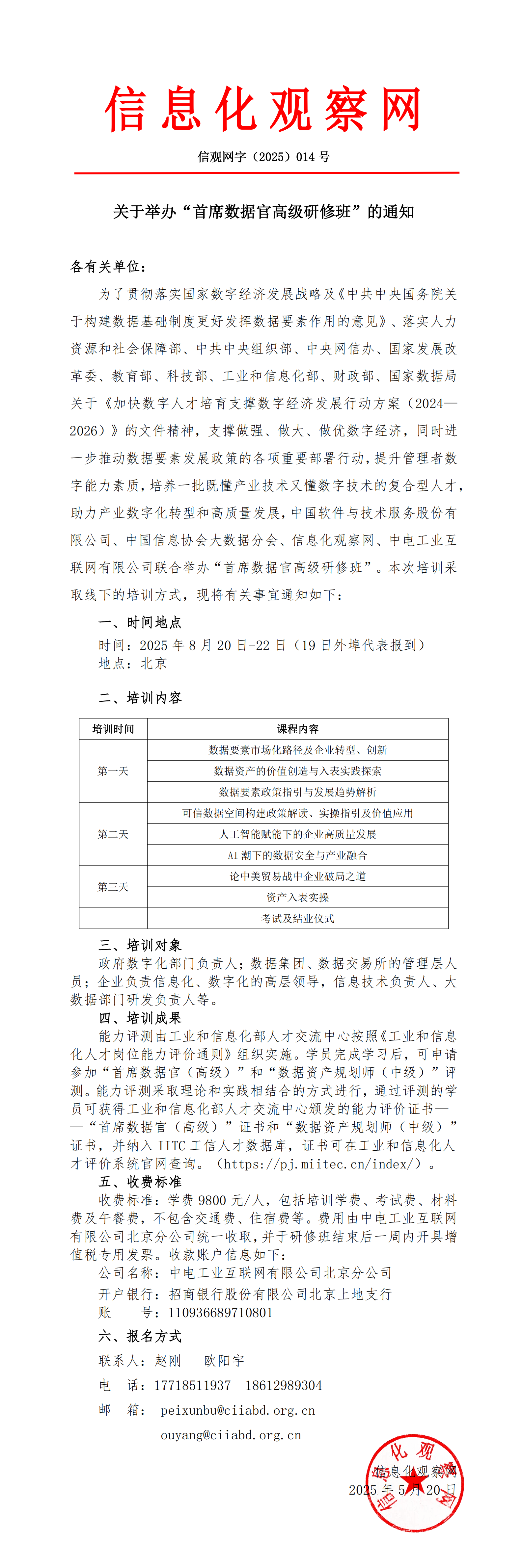中国软件与技术服务股份有限公司、中国信息协会大数据分会、信息化观察网、中电工业互联网有限公司联合举办“首席数据官高级研修班”。