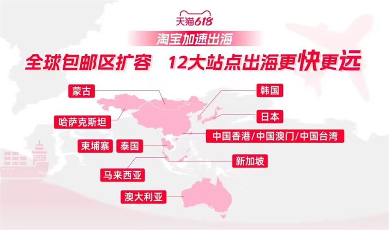 IT之家5月22日消息,淘宝今日官宣,今年天猫618,淘宝将“全球包邮计划”扩容至12个国家和地区,覆盖新加坡、马来西亚、韩国、中国香港、中国澳门、中国台湾、澳大利亚、日本、泰国、柬埔寨、哈萨克斯坦和蒙古国。其中,哈萨克斯坦、蒙古国首次加入淘宝包邮区。