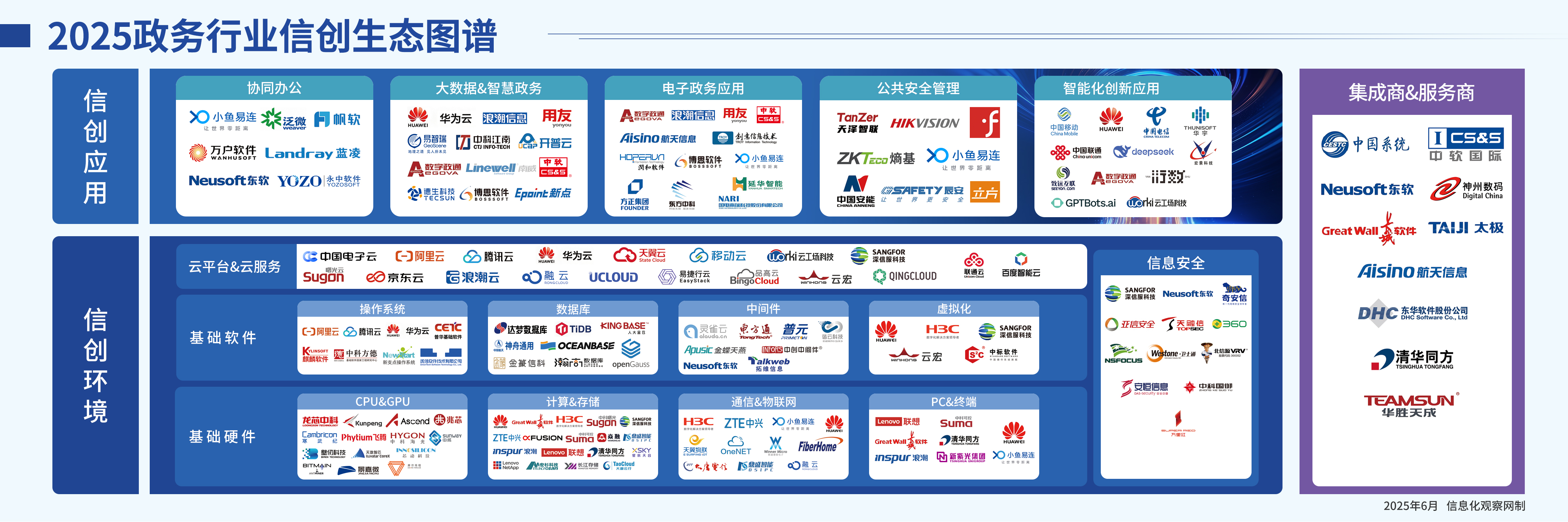 随着政策红利不断释放、自主创新理念深入人心,政务信创生态呈现出“链条完善、软硬兼顾、协同创新、智能引领”的发展新态势。6月26日,由中国信息技术应用创新峰会组委会、信息化观察网共同主办的“2025中国信息技术应用创新峰会”以闭门会的形式在北京成功召开。在本次大会召开前夕,信息化观察网围绕政务行业信创,从产品技术、市场、生态、应用等多个维度的研究和调研,推出“2025政务行业信创生态图谱”。这份图谱系统梳理了信创环境与信创应用,以技术突破与应用创新为切入视角,对政务信创生态进行了全景式展现。